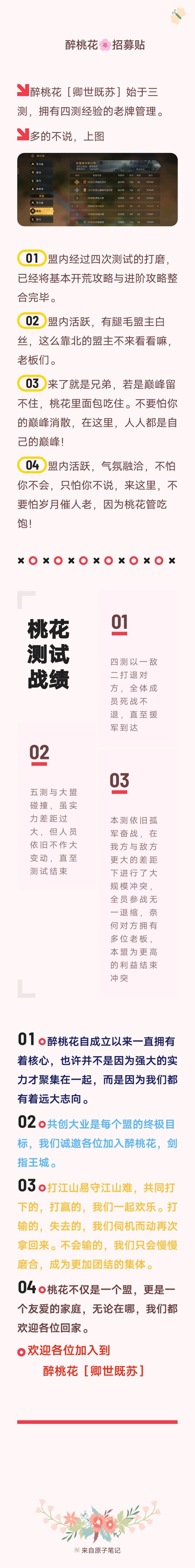 醉桃花[卿世既苏]始于三测,拥有四测经验的老牌管理。 多的不说,上图 盟内经过四次测试的打磨,已经将基本开荒攻略与进阶攻略整合完毕。 盟内活跃,有腿毛盟主白丝,这么靠北的盟主不来看看嘛,老板们。 来了就是兄弟,若是巅峰留不住,桃花里面包吃住。不要怕你的巅峰消散,在这里,人人都是自己的巅峰! 盟内活跃,气氛融洽,不怕你不会,只怕你不说,来这里,不要怕岁月催人老,因为桃花管吃饱! 桃花测试战绩四测以一
