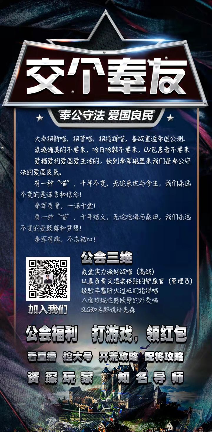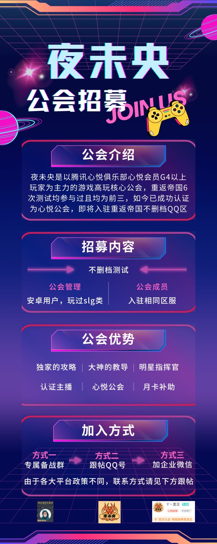 好消息!好消息!你们心心念念的重返帝国即将正式上线了,同时心悦公会【夜未央】正式备战不删档,加入方式1.成为管理,加入管理招募群2.成为成员,加入专属备战群