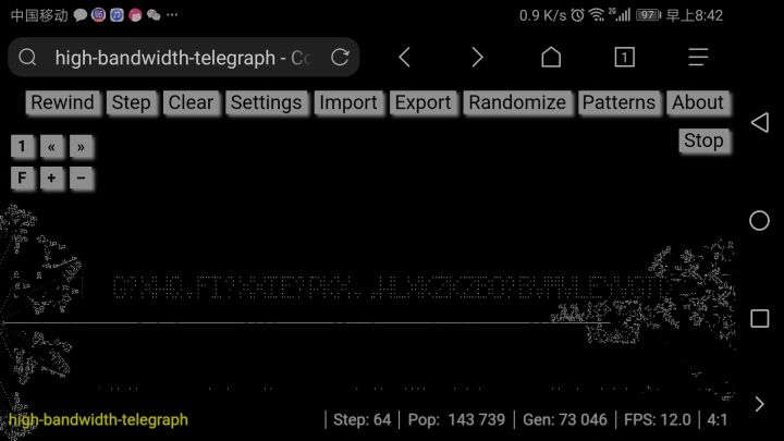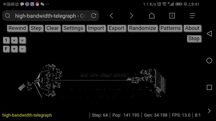 能够在手机上玩到这个游戏,还是蛮惊喜的。不过鉴于手机性能的问题,运行较复杂的图案时卡顿在所难免。但在选择导入/保存或其他界面的时候,滑动却仍然不太流畅。希望作者能继续做好优化。另外,大家可以访问copy.sh/life/来在线运行许多复杂的图案(同时也很震撼)。