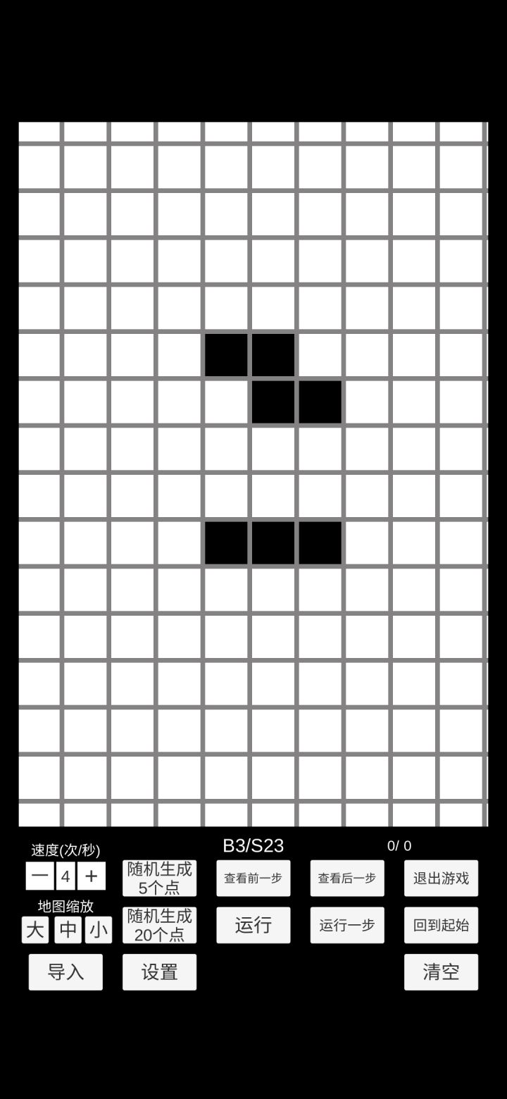 有些代码还是没法导入 比如x = 3, y = 12, rule =B3/S23 bo$3o$obo7$2bo$b2o$bo!另外建议保存绝对位置而不是相对位置,我存了一个只有正中间一个点的,再导入就变成中间往上一格的一个点了,由于有边界所以结果就不一样了