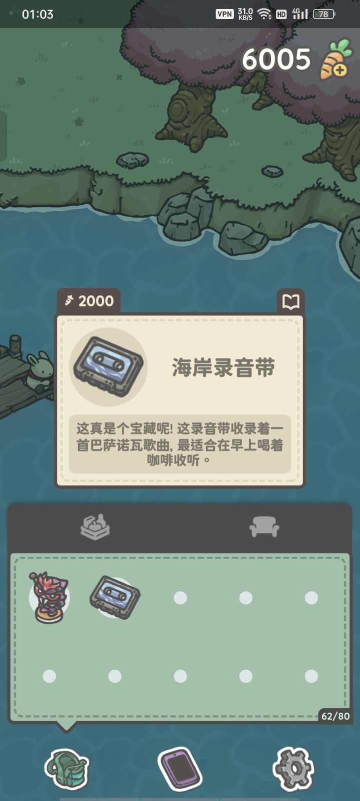 本作是2021年9月份上线的,兔兔很可爱,音乐和故事很治愈。但相比一代的月兔历险记,少了点善意与温柔。但这是一只倒霉的兔兔,到底是有多倒霉呢?也就手机和钱包不见了吧,然后回到家,家里也被偷的啥都没了吧。万幸的是亲爱的小伙伴给了一个手机,友好的尤里老板给床打了折,可爱的皮皮送了钓鱼竿。然后又开始了新的生活。=语言设置=本作现在是支持简中了的,所以不用担心看不懂。鼓掌。=下载方法=IOS: