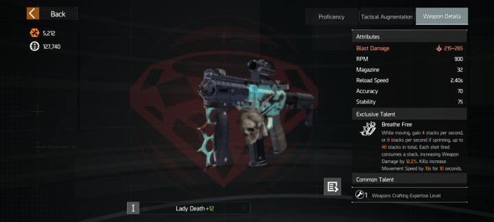 按照自己的理解试着解析了下本次测试的四把奇特武器。汤姆逊冲锋枪与钻石回眸取代了去年一测的训鹰人与话匣子。图一是个人在东南亚服目前的号。以下图文按序解析死亡女神(Death Lady):冲锋枪,弹容量在高射速下显得有点不足。独有天赋下奔跑时每秒+8层数(下方buff栏显示),走动+4层数,射击时消耗8层层数提升伤害等数值,击杀敌人后数秒内提升移速。这样的被动只能在需要频繁移动的职业手上才能完全
