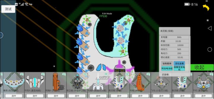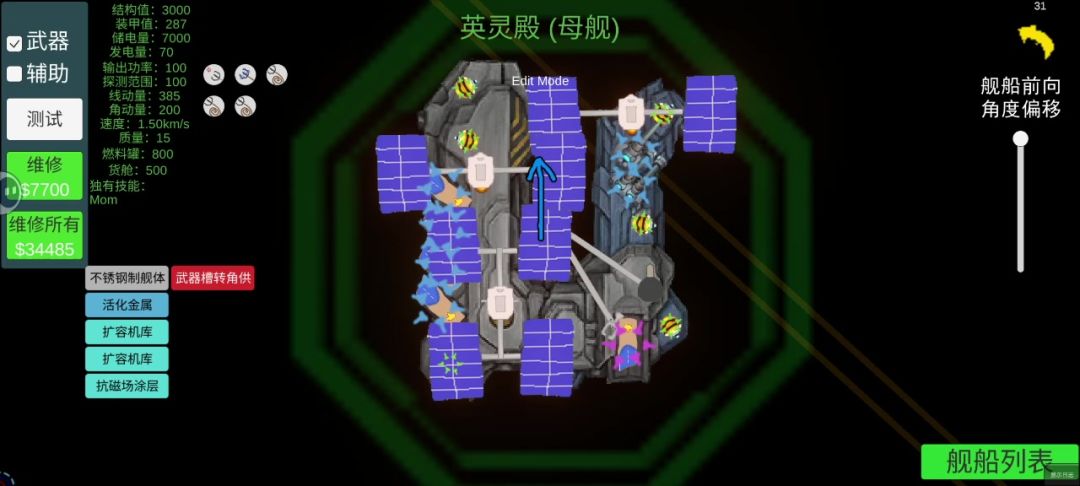一、舰船介绍: 英灵殿:玩家驾驶舰船(B级舰船)。这艘航母,有着五个舰载机库,两个蜂群导弹发射器,以及五个黄蜂拦截激光,同时还有三个小型护盾发生器,一个中型护盾发生器(左下角),自身的装甲值和血量并不突出,所以我们需要依靠护盾和激光拦截器来进行防御。 坦克I:敌方的三艘舰船(C级舰船)。拥有四个小型武器槽,三个中型武器槽,以及一门专属的巨炮,能够以损耗船体值为代价,发射出破甲能力极高的炮弹(A