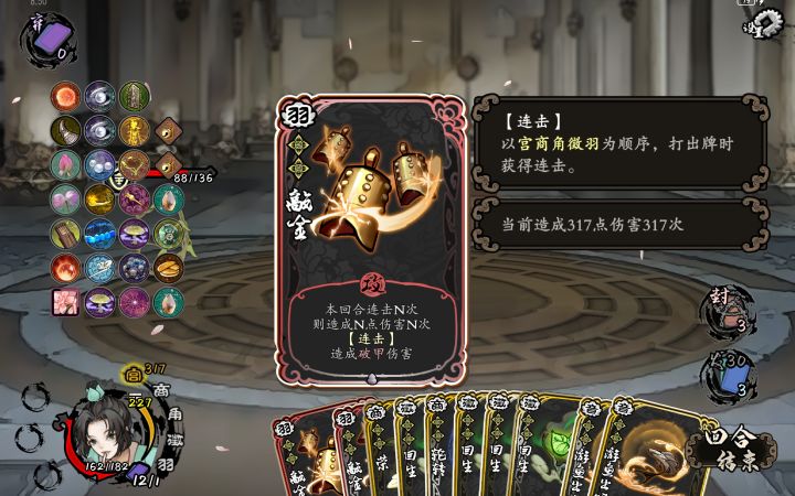 一、核心牌:敲金+游鱼出听+轮转+逆转+鼓乐饰品:博茕+陶埙+增摸牌类二、原理二级游鱼听音+3,逆转或轮转使得季节到春季,连击+1,则游鱼+4,博茕加倍,则游鱼+8,陶埙8连击摸一张牌,则再抽卡,后敲金打伤害。理论上可以无限抽卡,图中的敲金就是我第一回合打出来的,叠的有点烦了才停。三、注意1、游鱼要足够多,我觉得5个差不多,敲金单体,3个差不多。2、轮转和逆转到季节春季或冬季,其他季