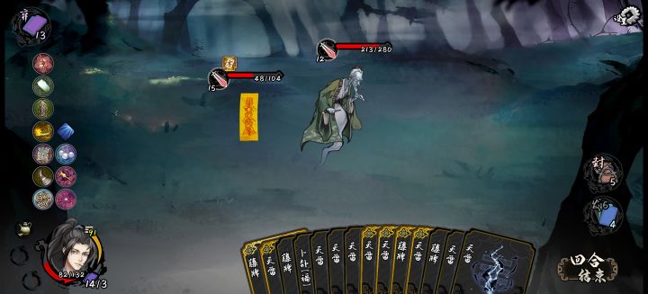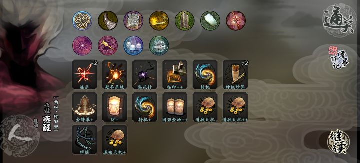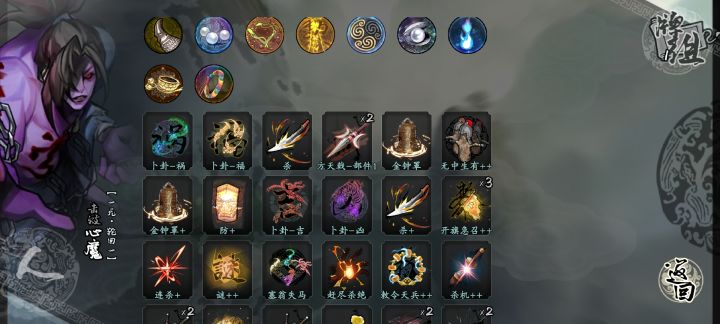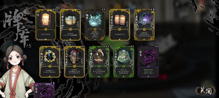 这套卡组我用着挺强的,emmm...就叫他随机伤害流吧,哈哈哈😁不过也有可能是因为难度一比较好打所以感觉很强打最后boss的时候两轮结束战斗。核心就是暗箭组合和吉卦输出,方天戟加伤,方天戟不嫌,梨花针和雷公锤补伤害。带调查可以找关键牌,杀机过牌,其他的说实话可有可无。上面那些护符,我忘了是什么了,只记得第五个那根羽毛,反正照着过牌增伤回血的来就好了。第五个护符很重要,效果是把所有随