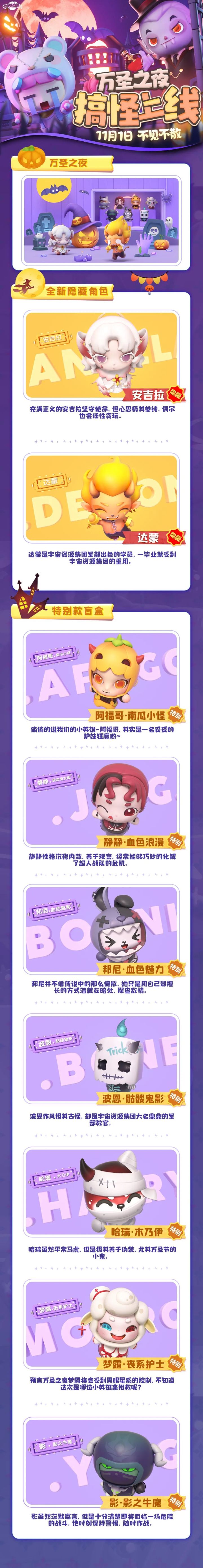 亲爱的超人们:哈林指挥部发布消息,《全民泡泡超人》将于2022年10月31日14:00更新「万圣派对 化妆舞会」全新资源包。预期于11月1日00:00开启全新盲盒系列「万圣之夜」及万圣主题活动,并对部分内容进行常规修复。届时将不会影响您的正常体验,本次更新完成后,我们将发布一个升级补丁,用于修复部分问题,请超人们在更新完补丁包之后进入游戏,以获得更好的游戏体验。新增内容全新地图场景<玩偶世界