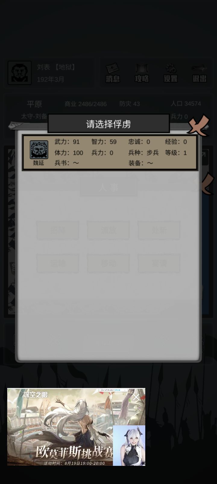 以下是萌新发言,请轻喷。人生之大迷惑1——防灾在一开始进入游戏以后,老老实实的读了新手引导(文字说明),然后意识到防灾这件事情不能落下。但是无奈自己选择公孙度开局,然后就发现了一件事儿,简单开局,你的防灾永远提不上去。当我努力的把防灾维持在50的时候,直接被公孙瓒一波带走。(ꐦÒ‸Ó)你个老六然后开了下一把,天真地以为防灾数值与智力武力相关。竟然傻乎乎地拿了一个笔记本妄图算出其中的关联。在