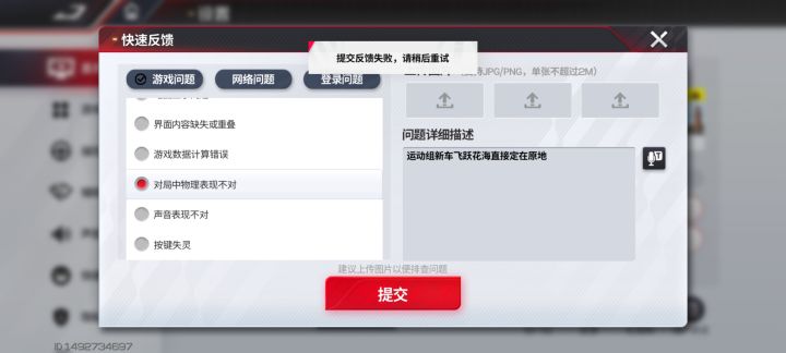 提交反馈添加图片还提交不了,离谱,新车出现这种bug,影响我充钱的心情#巅峰极速