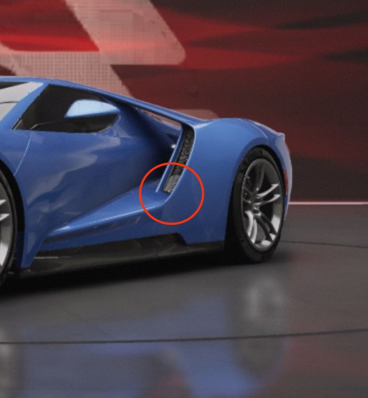 福特GT侧进气口细节这个很牛,但是我又重新看了下原车,发现虽然在细节上还原出来了,但是感觉是反了啊。实车是上白下黑,游戏细节处理是上黑下白。不过居然又发现有的实车素车也没有这个,所以我也不是很懂,就是外行,不知道应该是怎么样。有玩家开出这辆车了吗,在车库里近距离截个图我看看好不好。😂