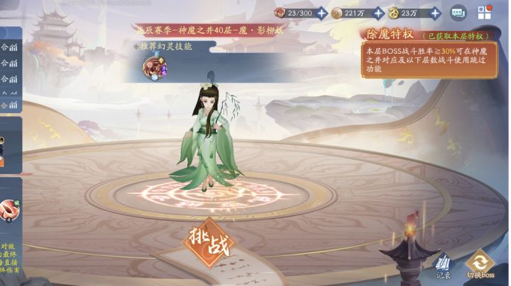 一、练度展示二、宠物展示三、通关视频四、答疑解惑1、boss要怎么打伤害? 答:boss开局给我方全体挂【缠柳】(最终伤害降100%,靠给队友加护盾叠增伤)+【魂逆】(无法直接打伤害,靠护盾值反伤) 用一句话总结就是用高护盾量侠客给队友叠盾,靠【魂逆】反伤打BOSS 2、最佳神祝是什么?a、徐长卿:精精、术术、体体、道运b、柳梦璃:道运c、王蓬絮:精精、术术、势势d、水阿奴