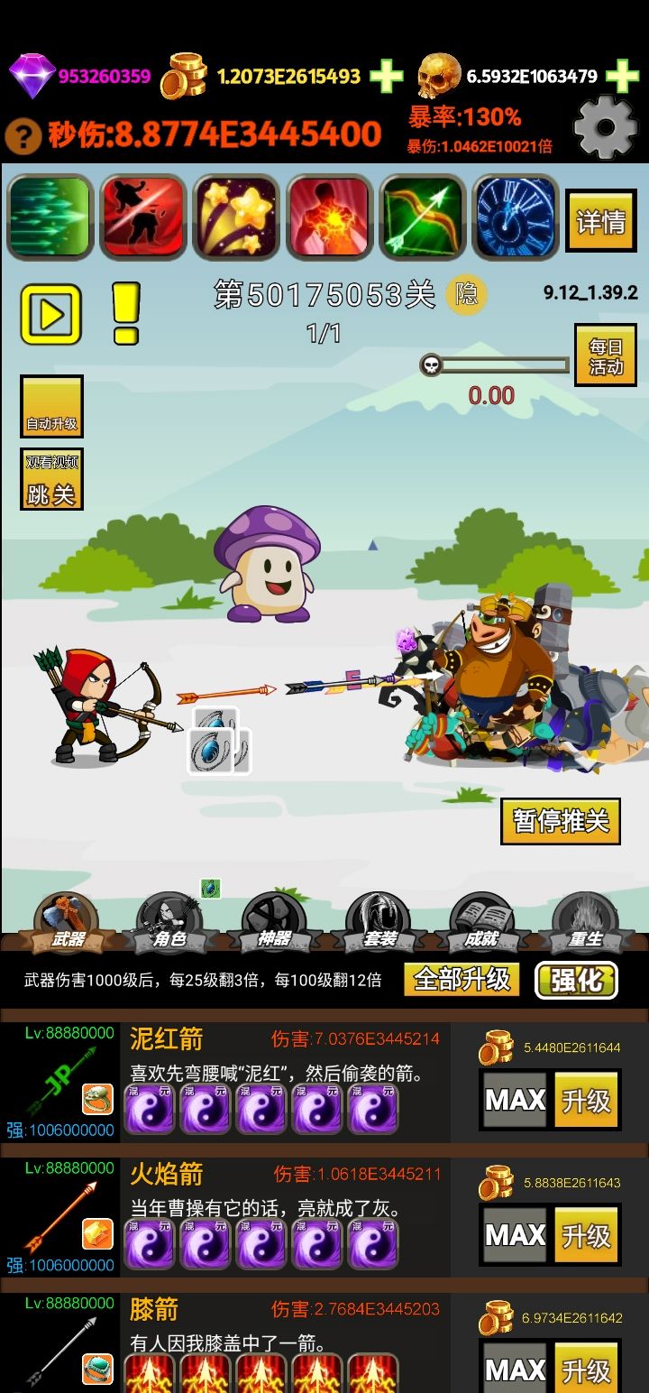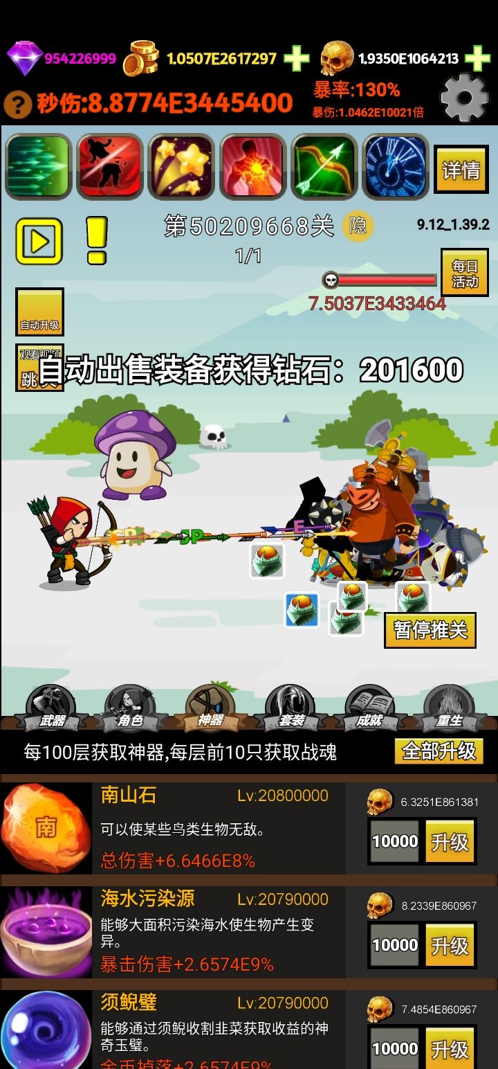 5000万关小目标达成。20把武器10亿强化。宠物230万级。角色50万级。广告407万一次。