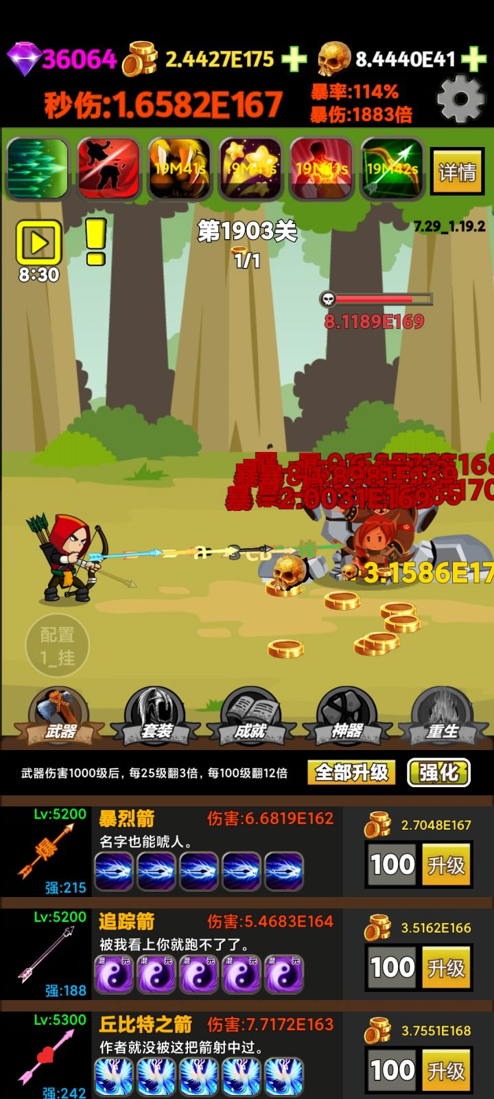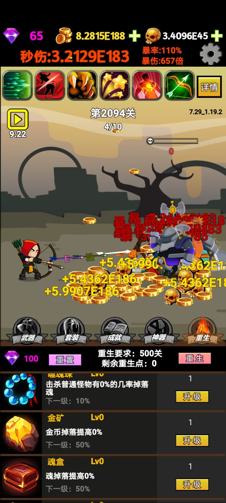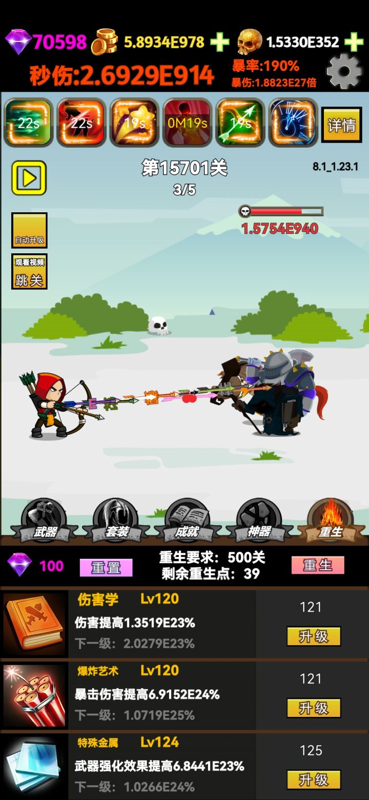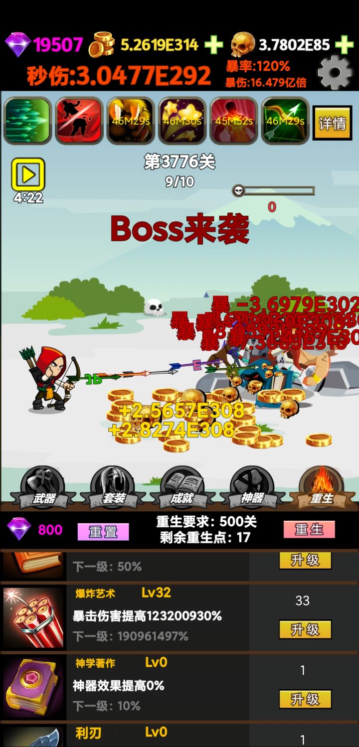 剩下的只能这三个重生技能升级了,算破局了,期待后续更新,总体来说就是数字游戏,打发时间不错!建议:数字单位用中文,并且加不同的颜色来增加史诗感,比如:十白色百绿色千蓝色万紫色亿橙色兆红色等等,这样会跟直观也契合这种纯粹数字的游戏。