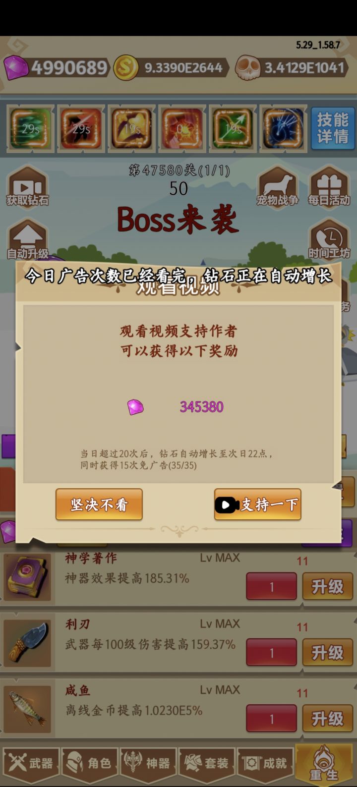 睡觉在线挂机,醒来发现没推多少层,有个boss挑战按键需要手动点,为什么?白挂一晚上