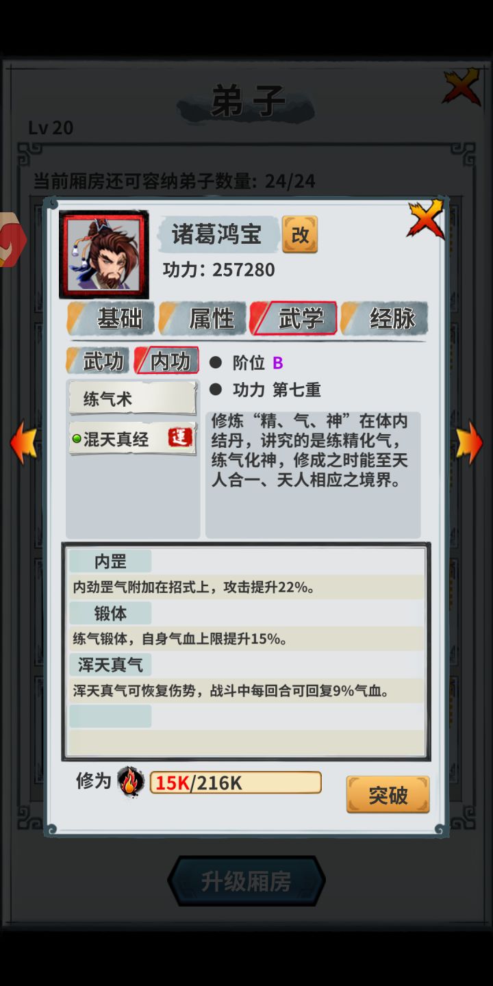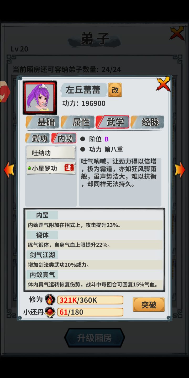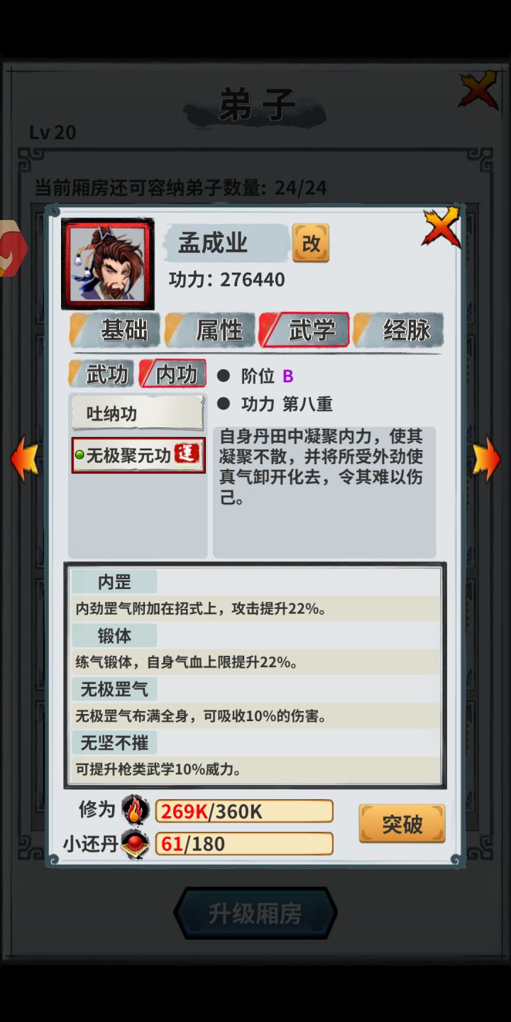 这游戏还是很小众,没多少人玩,但是游戏还不错,写一些自己的心得吧。1,开局人物5个人是不用按照指引的顺序选的,可以随便自己点,不用心疼看到s人物选不了.2.因为升级武功的经验是不返回的,建议一开局就升级山门,刷A级以上人物,有s级的就更好了.不然换一个人物,武功等级就要重新练习。3.优先升级演武堂,演武堂,演武堂,可以卡一天最后在练,一级武功经验就差很多。4.木材是升级的主要材料,所以木场