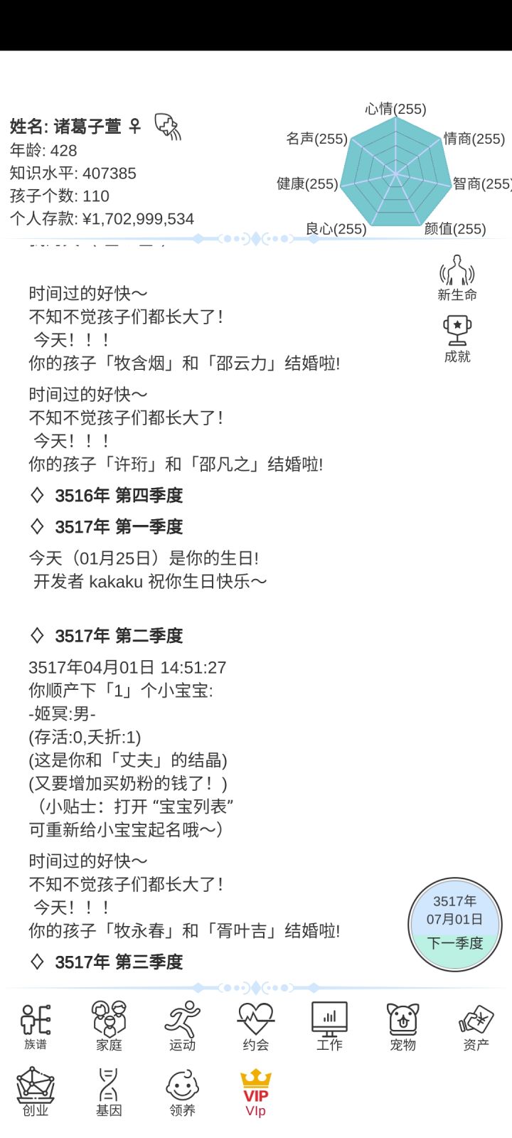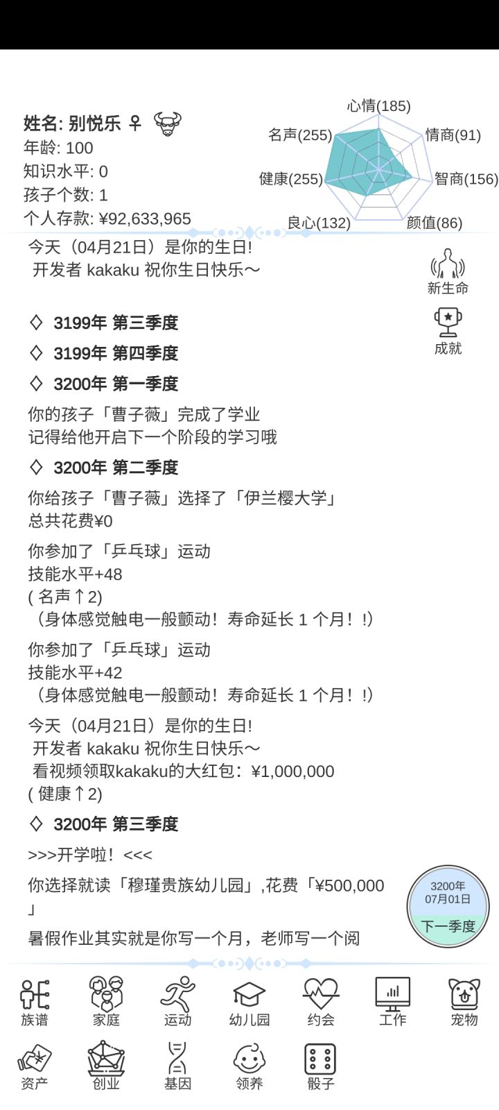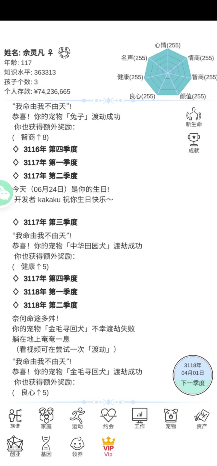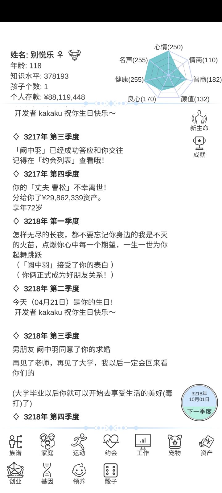 暴富的方法在这里和长寿的方法在这里(不全,看我的其他攻略贴 一. 暴富 1. 最推荐通过结婚暴富 十八岁以后就开始邂逅对象,多邂逅几个!!!(之后每隔几年就要去邂逅!!!)这个时候遇见的都是三十几岁的,这个年龄差就会导致他们死的早,你们懂得吧,遗产这不就来了嘛,一般通过高级就会邂逅,七八十的时候遗产在10,000,000~20,000,000。这个时候之前邂逅的人也七八十了,找他们搞对象然后结婚,死了找下一个。因为之前每隔几年就邂逅,所以咱们的鱼塘可大了,啥年龄段都有,这样死了一波又有一波,钱这不就伸手就来的事嘛 这里有个小技巧😈:看鱼鱼们的健康值,只要减少超过9点10点,基本上都要死翘翘了,高级酒会的鱼鱼们健康值少于100点就赶紧上,老头好呀,老头有遗产hhh 这条暴富方法不好的就是到自己七八十岁也要死了