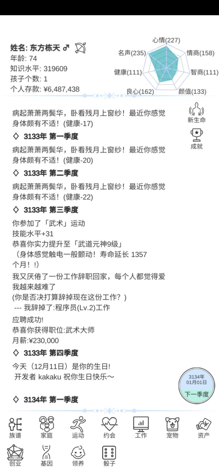 玩个游戏能不能别折磨人?一开始的我认为运动会加些属性疯狂练我认为好的跑步,偶然发现武术能增加寿命就专练武术。后来工作界面发现了有关武术的攻略,我就狂练武术,然而只有长大后有稳定工作了才能有时间刷武术。