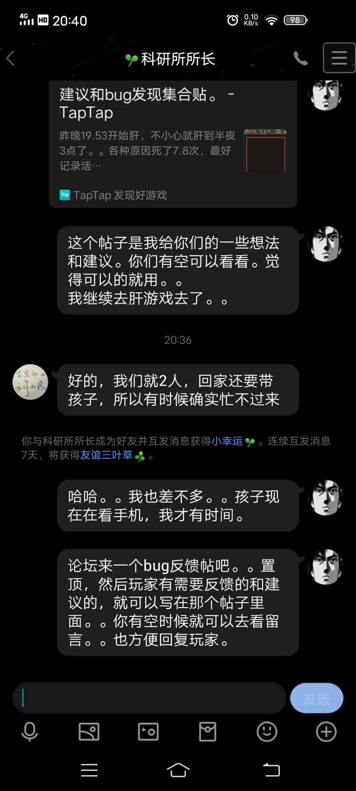 昨晚19.53开始肝,不小心就肝到半夜3点了。。各种原因死了7.8次,最好记录活到30多天。太入迷了,这锅你们得背。。😍😍这是新游戏,估计只经过了作者内部的测试,没有经过玩家的大量测试。目前bug略多!!但是玩下去,可玩的地方也多,还有非常大的提升空间。。这游戏我是真爱!!很有策略性。。只是缺少足够的攻略,游戏里面也没有指导和详细说明,所以新手上手难度极大。。我玩的时候,没有领免费的矿泉水,都