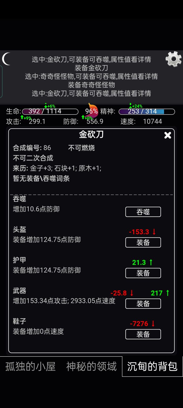 如题,按官方合成,金砍刀=金子3+石块1+原木1,但有时…有个大佬攻略说,生铁21和原木11能合成铁盔铁甲,生铁20和利齿40能合成狼牙棒,不过虽然属性也不错,但一身奇奇怪怪物套装总有一种马赛克战士的赶脚另外我用同一个民间配方,两次做出奇奇怪怪物,一次做出N号木炭如果是bug反倒可以期待,但如果不是的话,食谱不按开发者提供的来,无论食材多奇葩,连肉沫浆果果果榴莲炒种子这种菜都能整出来。而