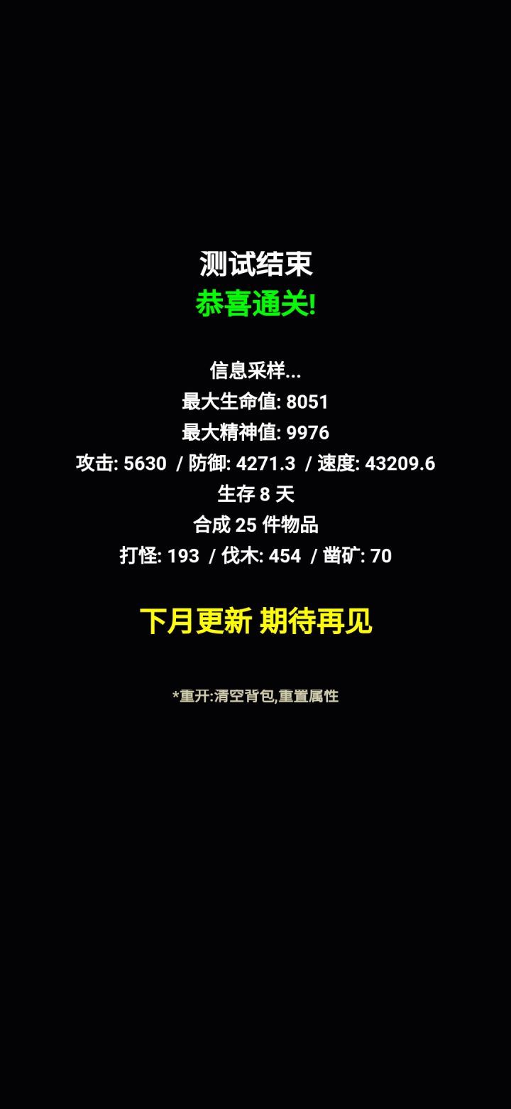 【个人一些简单建议】我是非常喜欢这类生存基建种田游戏了,类似的还玩过荒野生存、小黑屋,此游戏玩了一个下午,说说我觉得需要改进的地方,个人意见:1.趣味性还有待提高。比如武器升级、路上的随机事件(不单单指遇上怪物),季节变化等。2.种田一个个点太麻烦了,能不能来个一键收获呢。3.沿海居然不能钓鱼就很难过了。4.野外生存:干净水、盐的获取,也可以添加进去。5.为了增加难度,背包初始可以设计10-15-20等逐渐升级扩大格子。如果想作者想赚钱,可以来个商店。6.困难模式:太紧凑了,BOSS来的也太快了,让我们这种想挑战困难模式的生存党有点不适应。简单模式呢又没有目标,或许可以考虑开个成就系统?