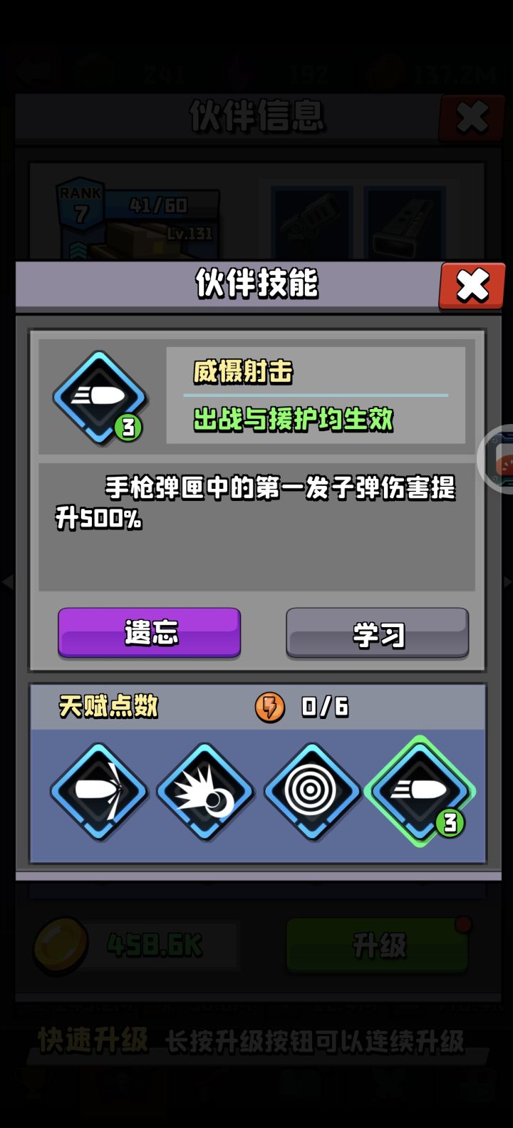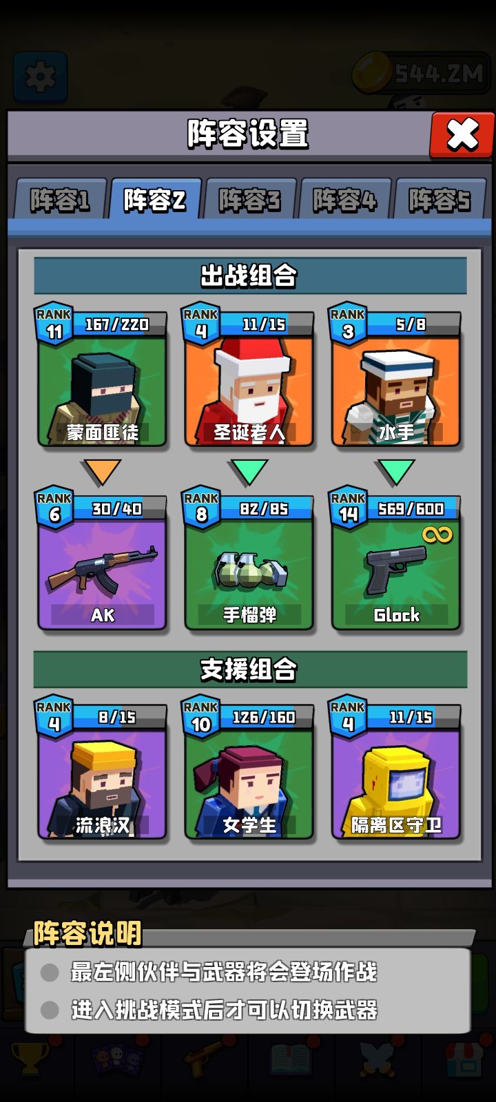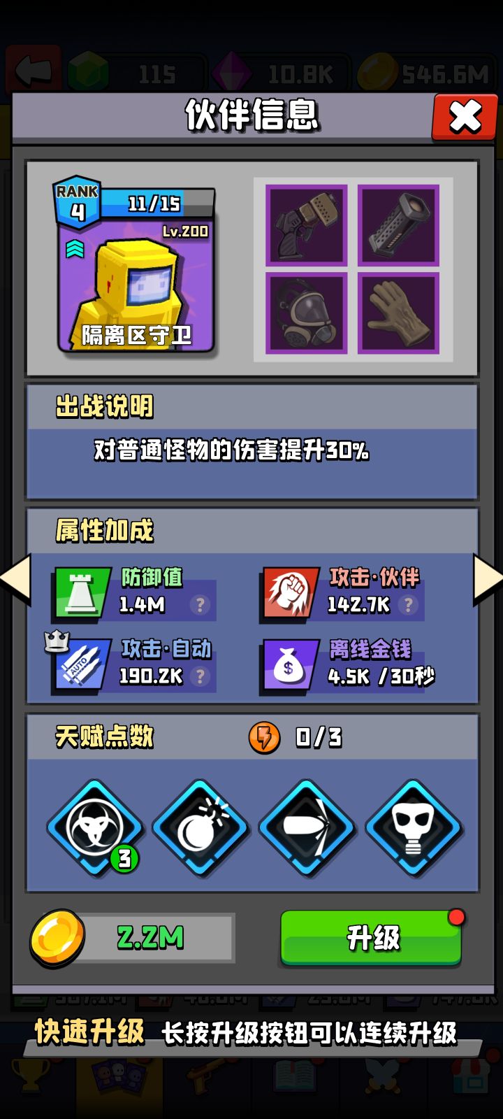 加攻击力的人物暂时选择蒙面匪徒是最为主流也最有性价比的。在前期刷商店时,一定要看见就买,快速提升到9阶就很够用。需要注意的是,等级越高,金币的属性收益越低,所以在蒙面升到500级的时候,可以适当提升其他角色平均在100级的样子。稍微注意下就能发现这个设定。