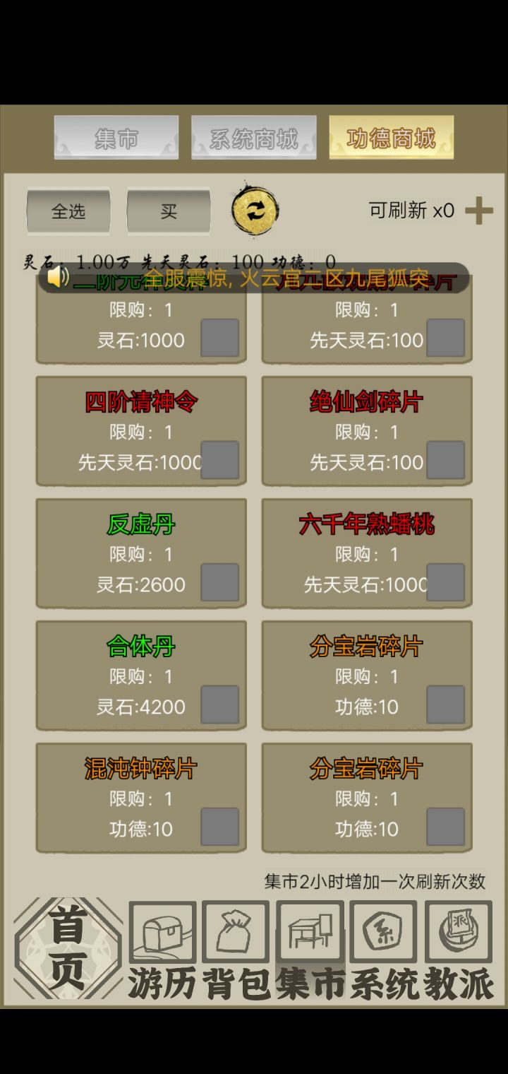 前面是一些基础版,后面还有进阶版需要想了解游戏一切内容,可以留言,有空会进行补充!本攻略部分数据来源于官方及混沌一区主宰ibm大佬属性镇楼广告卷:商店各5次游历5次(上限30,看广告超过30只计算上限次数)分宝崖3次(可出橙红紫装碎片)域外魔头3次(不能同一只)天地机缘1次论道1次信紫气得永生洞天福地刷新1次洞天福地增加1次仙岛2次(周六周日看完广告有9次机会)天外