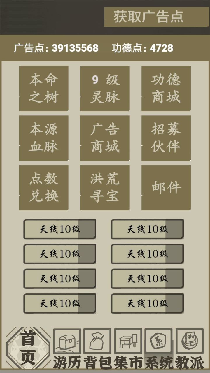 3,广告点用法。有2条路线可以走,第一种是升级天线,目前全5级后单点天线比平均点省时间。天线目前10级满级,8个10级满天线一天可以收益407万广告点收益。第二种是前期用广告点去兑换灵气,升级境界抢占资源。个人建议要是打算在这区长期玩那还是升天线。