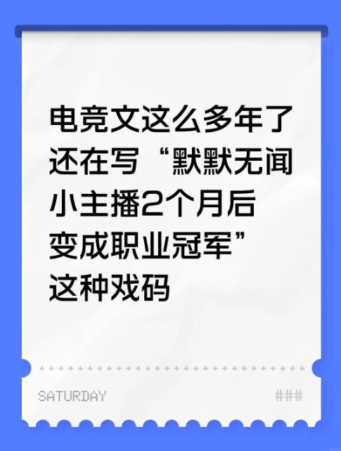电竞文套路:主角本是默默无闻小主播在一场直播中带飞职业队友然后被黑粉追着骂,两个月后主角摇身一变加入黑马战队拿下冠军打脸所有人现实是:全网夸奖的主播青训后就查无此人这个世界上天才太多了天才只是站上赛场的门槛还有速通款,20天就能普通职业联赛然后干神秘事情退役的顺带一问,有没有什么好看的电竞文推荐一下#今天游戏圈发生了啥 #单机游戏 #发现好游戏 #手机游戏 #浅评一下 #