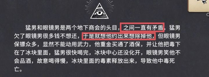 1-2的饮酒故事第一句要么改成“之前一直有矛盾”,要么改成“两人之间一直有矛盾”。第二句要么改成“于是就把他约出来想除掉他”,要么改成“于是想把他约出来除掉”。另外这个故事存在两个逻辑硬伤,既然有矛盾,怎么会屏退保镖跟猛男在不熟悉的地方喝酒?二就是,有钱重金买通酒保没钱还?当然可以说欠的钱远高于买通的钱,那为何要强调“重金”多此一举呢?既然是保镖众多,又有很多钱的大佬,酒