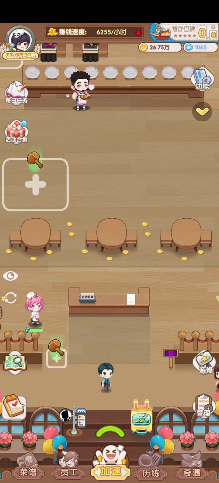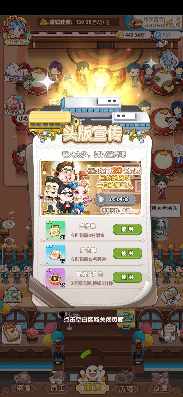 1招募顾客几乎没有作用,稀有顾客花费也不比普通顾客多。既不用道具也不送钻石,好评卡。2餐厅金币可以点加速一键收钱,但是餐厅14个互动建筑要一个个点,是否也可以一键收取。3游戏音效和音乐已经关闭,但是收听喜马拉雅app,声音会变得很轻。4二号餐厅揽客很拖后腿5历练打怪消消乐体验感很差,探险倒是还行。6菜品搭配如何提升收益还需要优化。7三个集市7天已经把唯一性物品全抽光了。