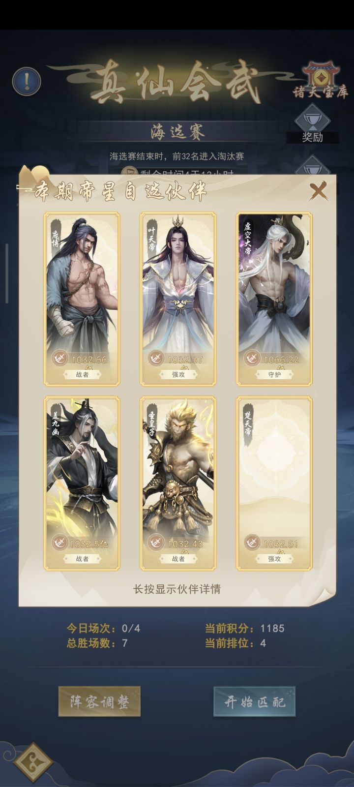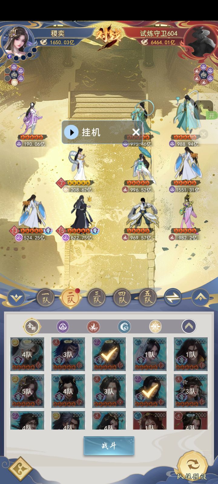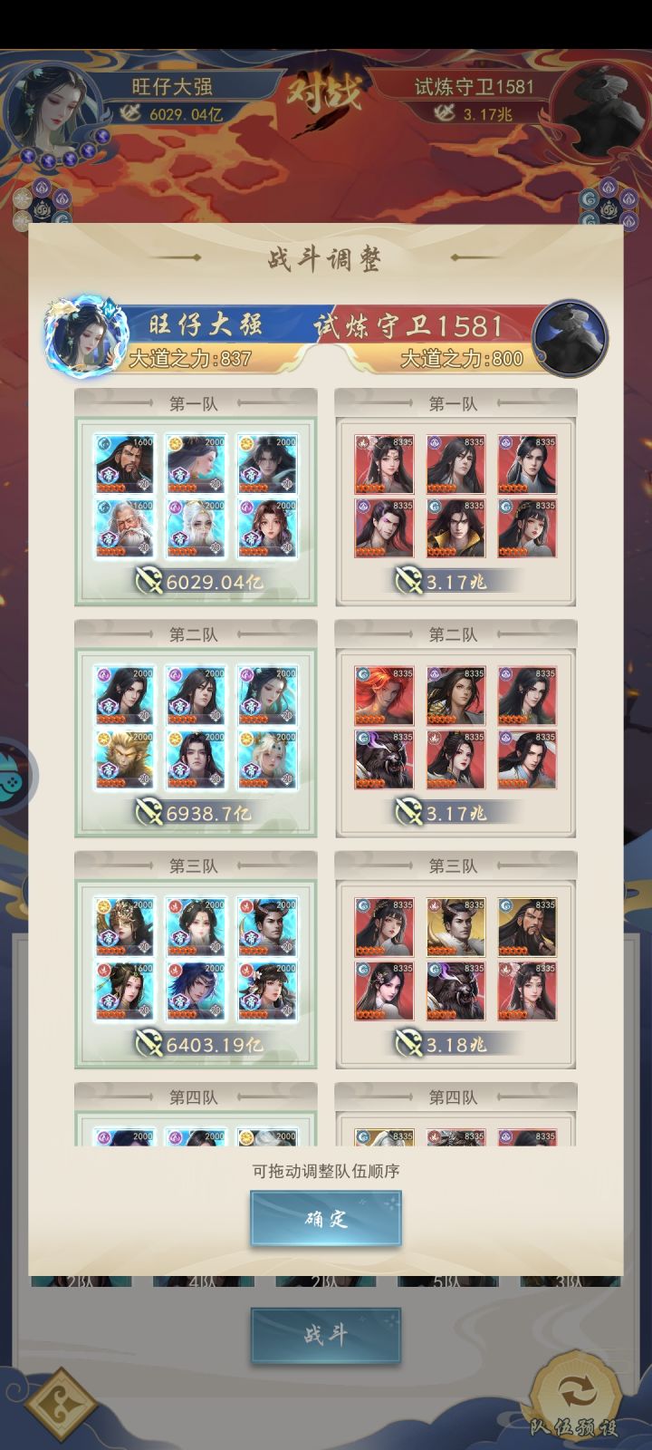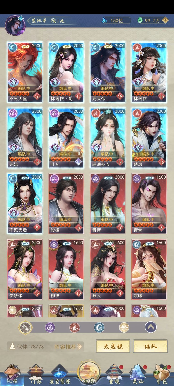第三日新增注意事项:活动会在晚上9点结算,注意拿完奖励,在天下第一活动结算前转换门派去第一势力,拿排名奖励。从第三天开始,因为没有额外的罗盘,开图速度会大幅度减慢,晚上九点活动结算会有很多资源。一、阵容与战力进度这是第三日奖励结算以后的,开了5山,段徳四极圆满可以段徳换荒天帝,也可以黄牛换段徳。二、开山进度第三日太虚试炼结算以后会有道元奖励,每天道元拉满5山不是问题。三、开图进度我没