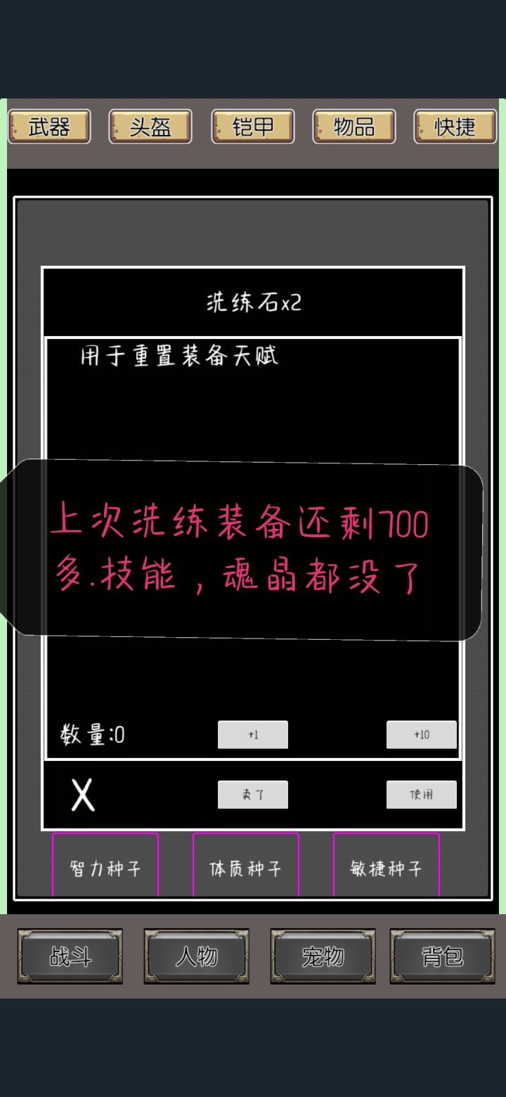 玩了两天,突然发现什么都打不过了,才发现身上的装备和背包被无情的清空。。。很无奈,别的无所谓,职业装备可惜了。小游戏就是这样的无奈,只能自己忍下了。😓😓😓