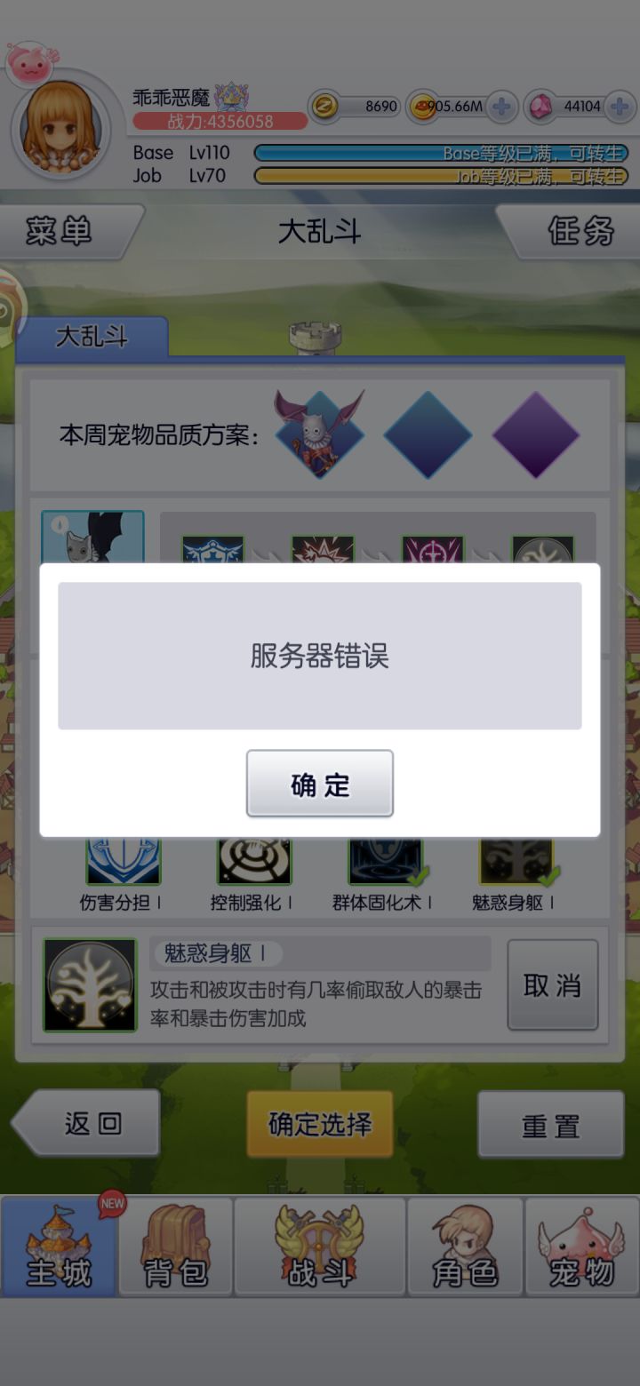 服务器错误!!!宠物乱斗 选一开始一选宠物确定就服务器错误然后换了个宠物能进技能选择 但是选了技能一确定还是服务器错误!!!!!!😡😡😡😡
