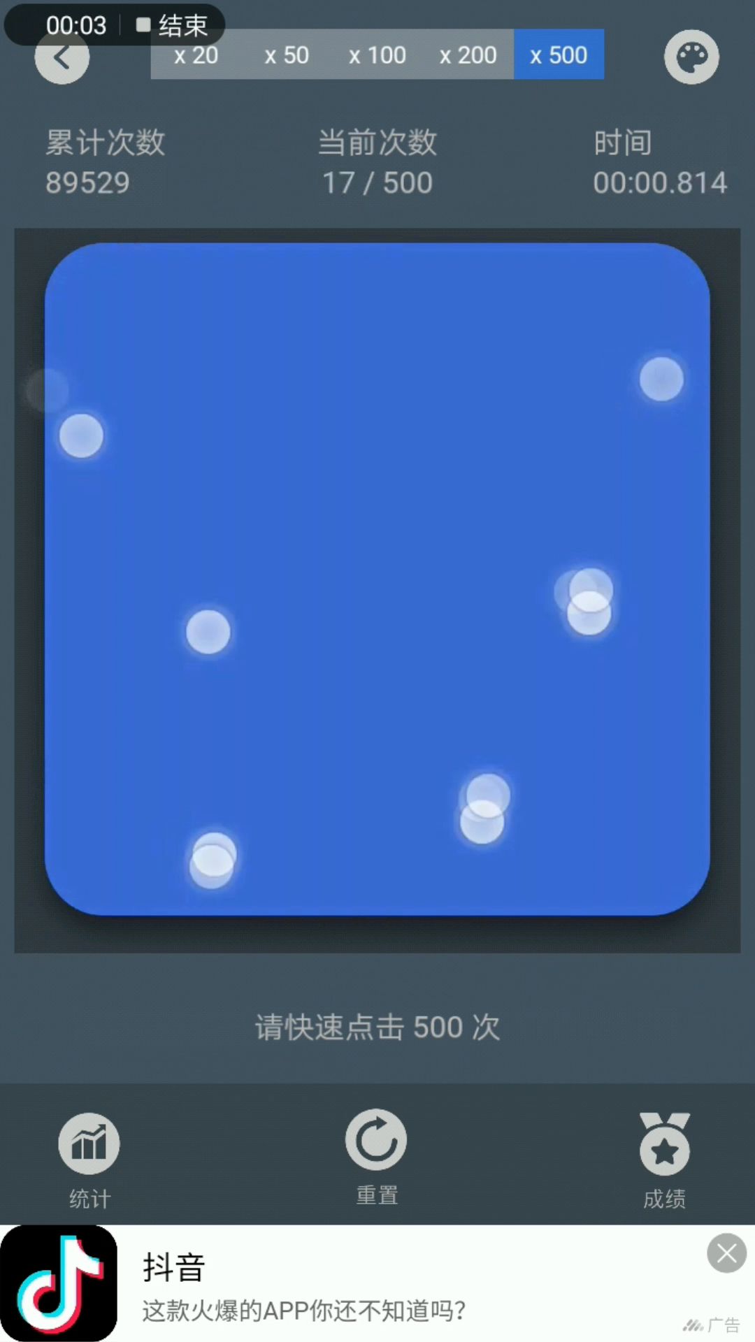 为了更快的完成,手指得点准,然后上下切换要连贯,怕衔接不了可以猛一点,多戳几下总能点上。要冲记录可以多来几次,找一个顺一点的开局,20/50基本不能有失误,点错,点歪,卡顿,立刻重开。 另外软件有点问题,重开了不能立刻点击,需要点击开始,然后点一下统计,再返回才能点得动。