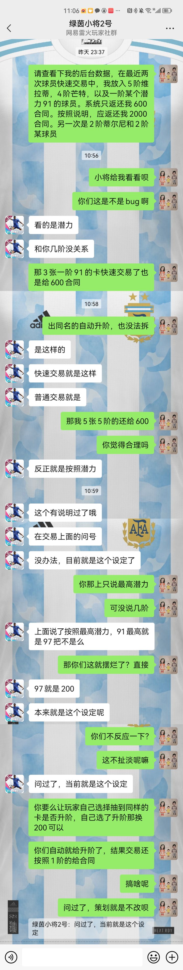 就你们策划这摆烂的尿性,你游戏不黄你都得给我们热爱足球的玩家磕几个。3张1阶91潜力紫卡快速交易给600合同。3张5阶91紫卡还给600合同?我是惊呆了!反正这就是规定,我不管合不合理,我就不改,爱玩不玩。你觉得有问题,就是你理解错了,我们是不可能错的。