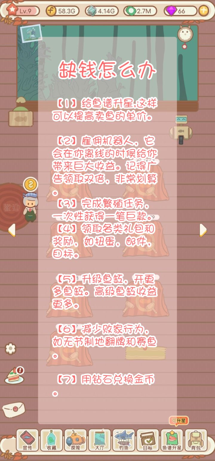 哈哈哈!没错又是我!上个版本也写过总结的我!不废话了,下面开始唠嗑:一、基础篇1.鱼缸:有钱就开新鱼缸,不用升级,前期升级没用,升级是用来无聊养老的。2.饲料厂和玻璃厂:有钱就可以升,前期不升鱼缸,等级大概这样子就够用了:产量10级/容量15级。3.鱼:前期不用着急赚钱,跟着探险船的等级材料均匀放就行,等级一般升到六七级,然后金币就够用了。4.左侧鱼缸:养着玩,没啥用。5.机器人:废话!