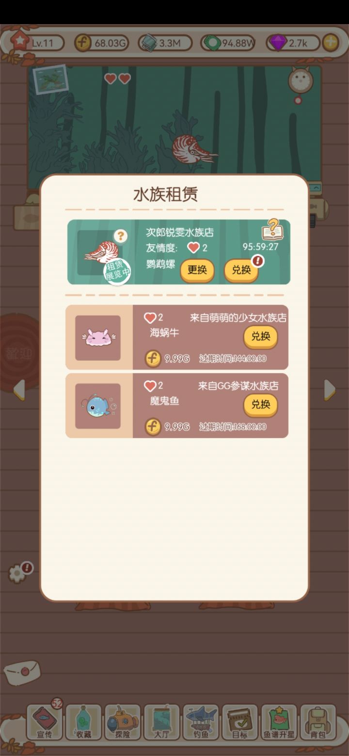 为什么我景观鱼少了一条啊,求官方回应😭我先是养了一条小飞象(好像是叫这个名字),好感度满的,十颗星,但是还不能用鱼兑换。然后我把它更换成鹦鹉螺。之后就不能再选择它了,没这个选项(如下图)