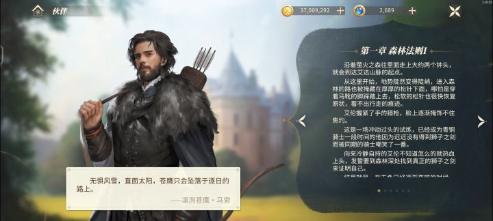 马索,一位狩猎者,一个被森林承认的猎人。无惧风雪,直面太阳,苍鹰只会坠落于逐日的路上。凌冽苍鹰·马索的座右铭。不在鹿群的繁衍期狩猎,遵守森林的法则,是猎人也是保护者,是被森林所承认的猎人;动物不害怕猎人,这是猎物对狩猎者的致敬。《萤火之森动物繁衍季禁猎条例》,年轻领主感恩马索所颁布的法律条例:谨献上对森林多年来馈赠的感恩之心。第一个满命的SSR角色,我感觉马索的故事也是很棒的,人物塑造的很