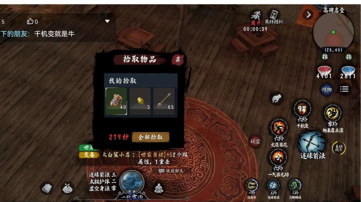 天山之巅通关攻略:练一个弓箭。天山之巅一,紫弓+4,黄公箭术中学满,应该就很稳了。我这身行头,全程用弓箭射。打完剩5分多钟。天山之巅二,三。用弓箭,一样简单。祝大家开包必出货!