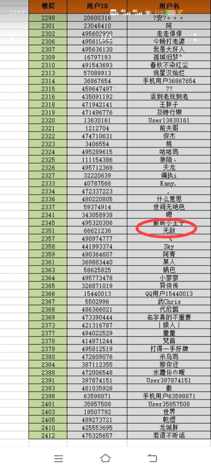 管理大大,名单出错了,名单错了如图,我跟对象两个号。都在名单里,但是都有不同的错误:名单2644层,“王陆”号,用户名是,楼层和Id都不对;王陆的楼层在2247层,323509911名单2706层,楼层和Id对,用户名错行了,用户名应该是名单中2708层的天道,串行了,大晚上的核对名单,不容易,希望快点再核实一下辛苦了