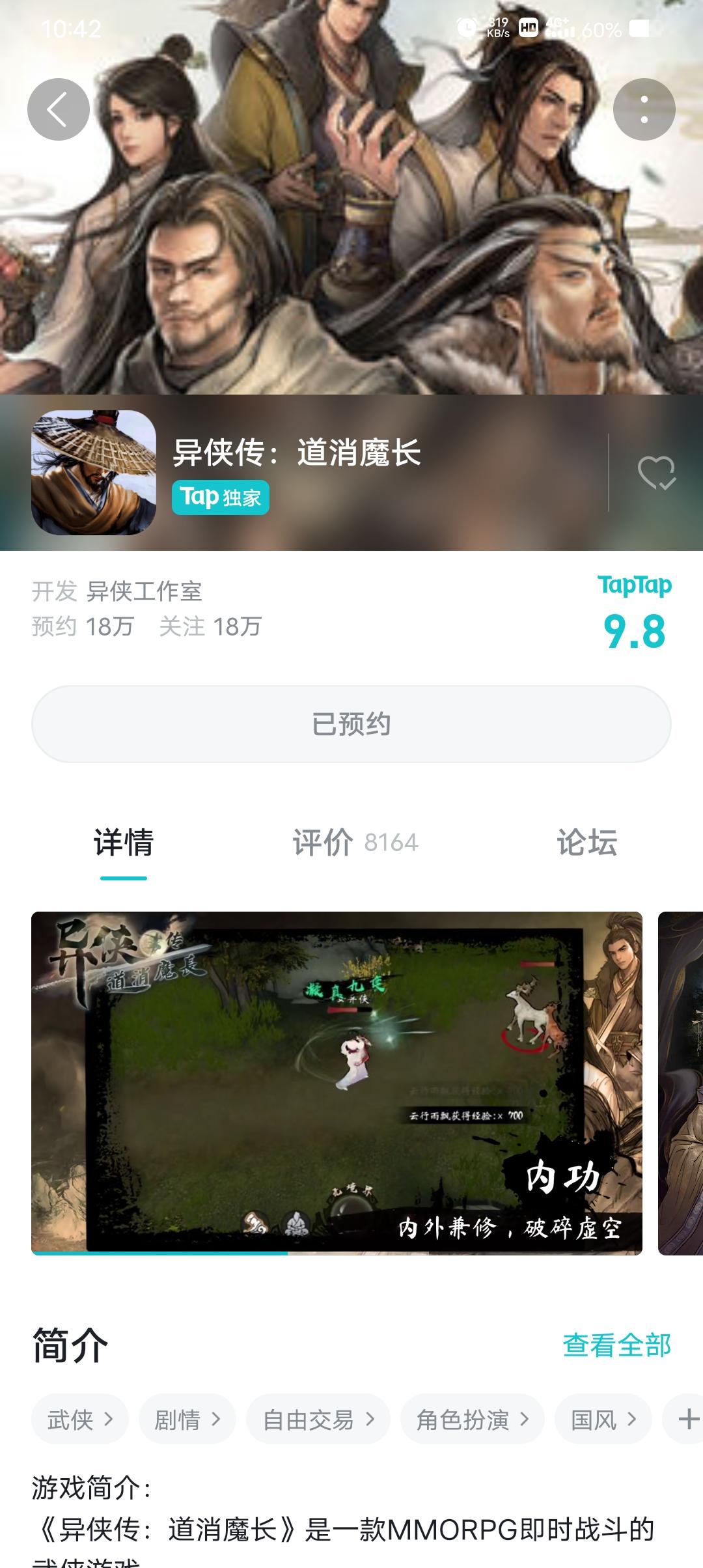 我是很喜欢武侠的。初看介绍时感觉这就是我梦想中的武侠游戏!看完了开发者的话,觉得开发者应该很喜欢游戏。很喜欢武侠!做这款游戏给我的感觉一方面是为了给自己圆梦,很浪漫,很有情怀。又有一种不为得失记。广交朋友!大摆宾宴。结交天下豪杰的感觉!哈哈,开发者在古代一定是一位豪爽的大侠!想到了《侠客行》中一句诗来形容:《三杯吐然诺,五岳倒为轻》