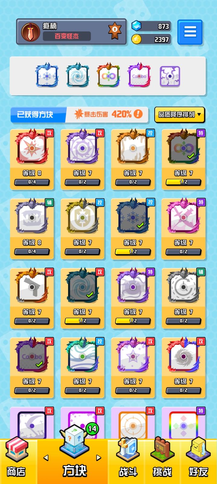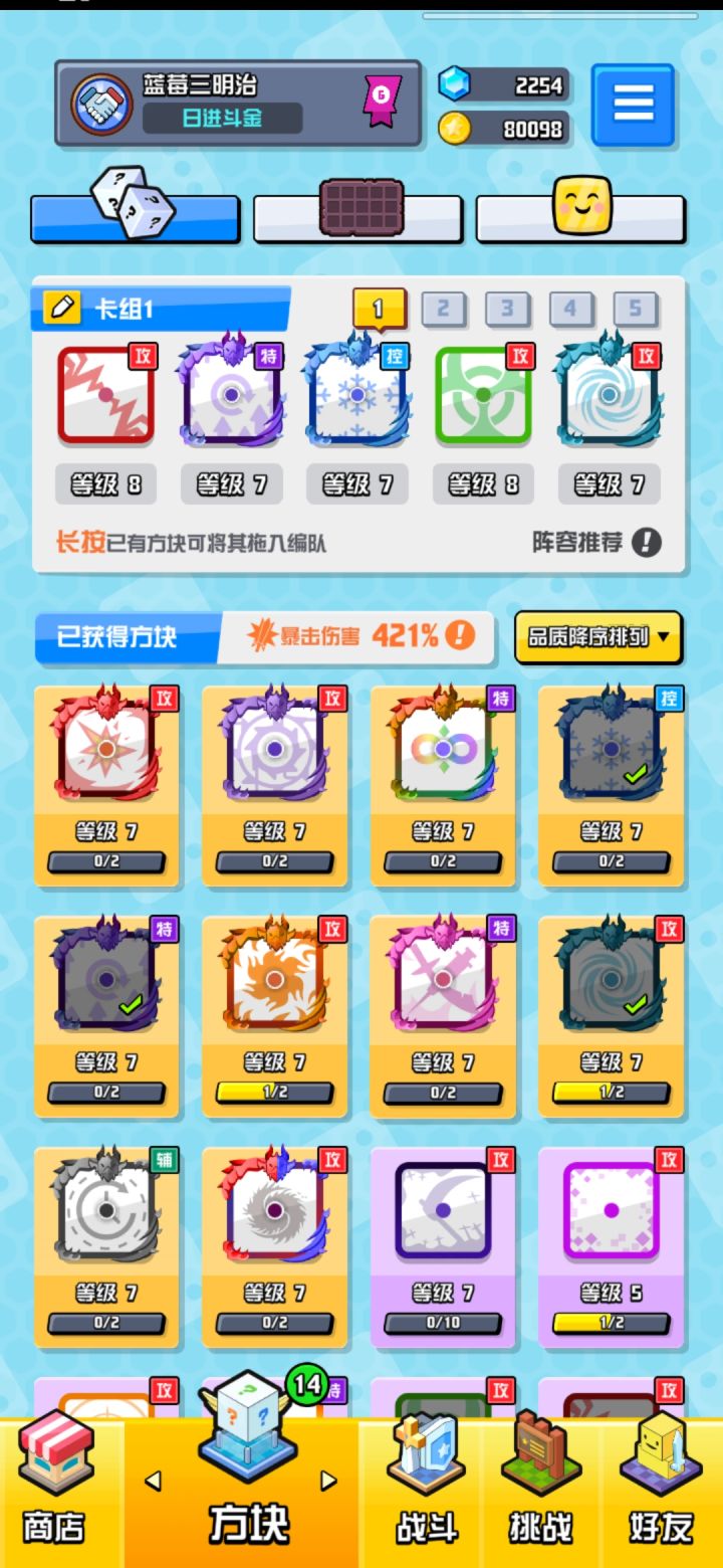 裂隙成长方块:局外每升一级,增加2%升级概率,局内也是增加2%因此在合作模式中,后期有余钱应该升满。毕竟合作模式玩到后面,一千多sp召唤一个方块,万一赌不中,sp就打水漂了。升满了起码还多了10%概率。十级裂隙方块局内升满应有80%几率升星,还是划算的。这个方块应该是升到二十级刚好100%几率。强电方块注意,这个方块三星以下不如同级别其他史诗攻击类方块,所以三星以下的这个方块可以不要了。四