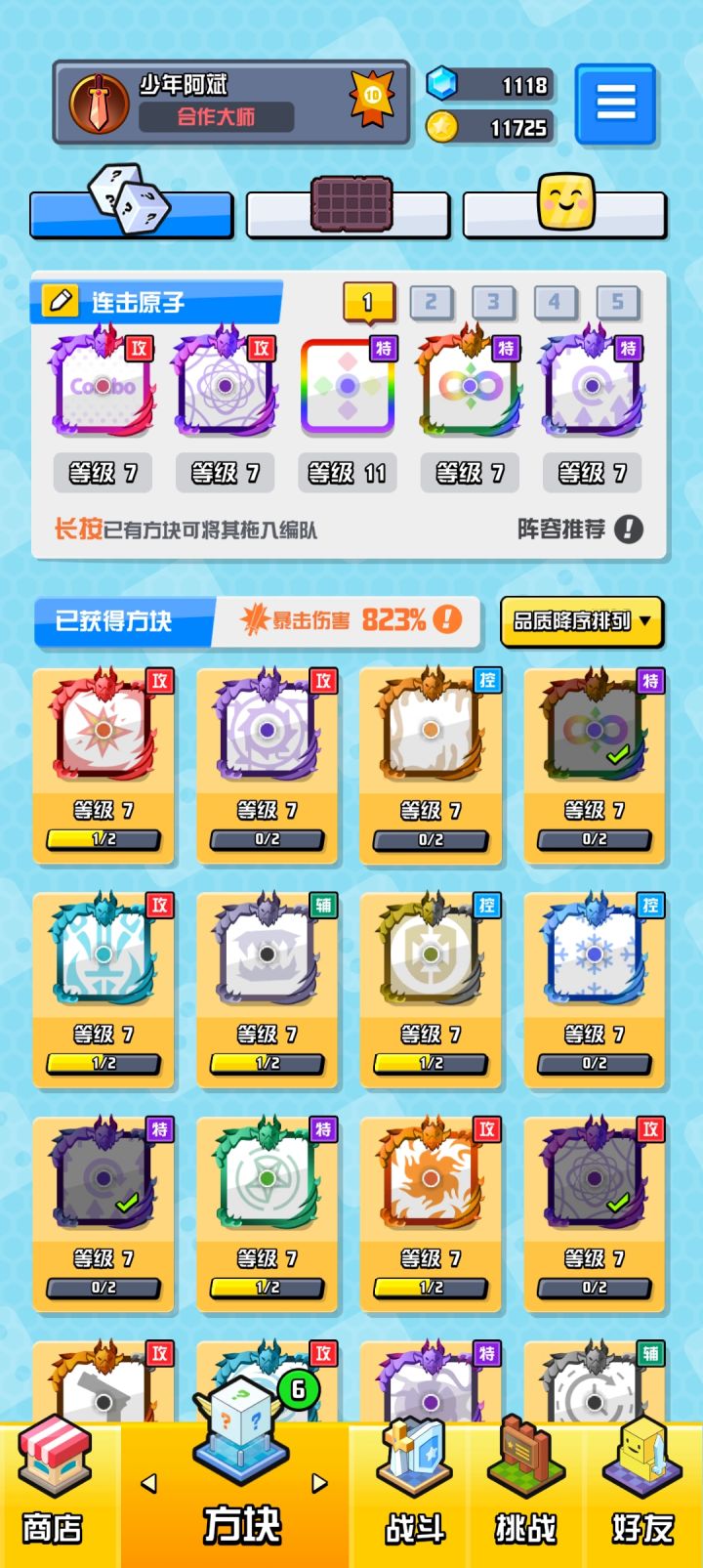 连击原子方:合连击等级的时候记得留种子,123级的连击方块的一定要各留一个,小丑和适应都优先给连击方块,这样100层能150左右连击,合成方块的时候一定记得优先提升外圈方块等级,这样遇到随机骑士的时候原子才能发挥作用,一句话总结:前期留好种子,资源优先给连击,合成优先往外圈合,保持外圈高等级。
