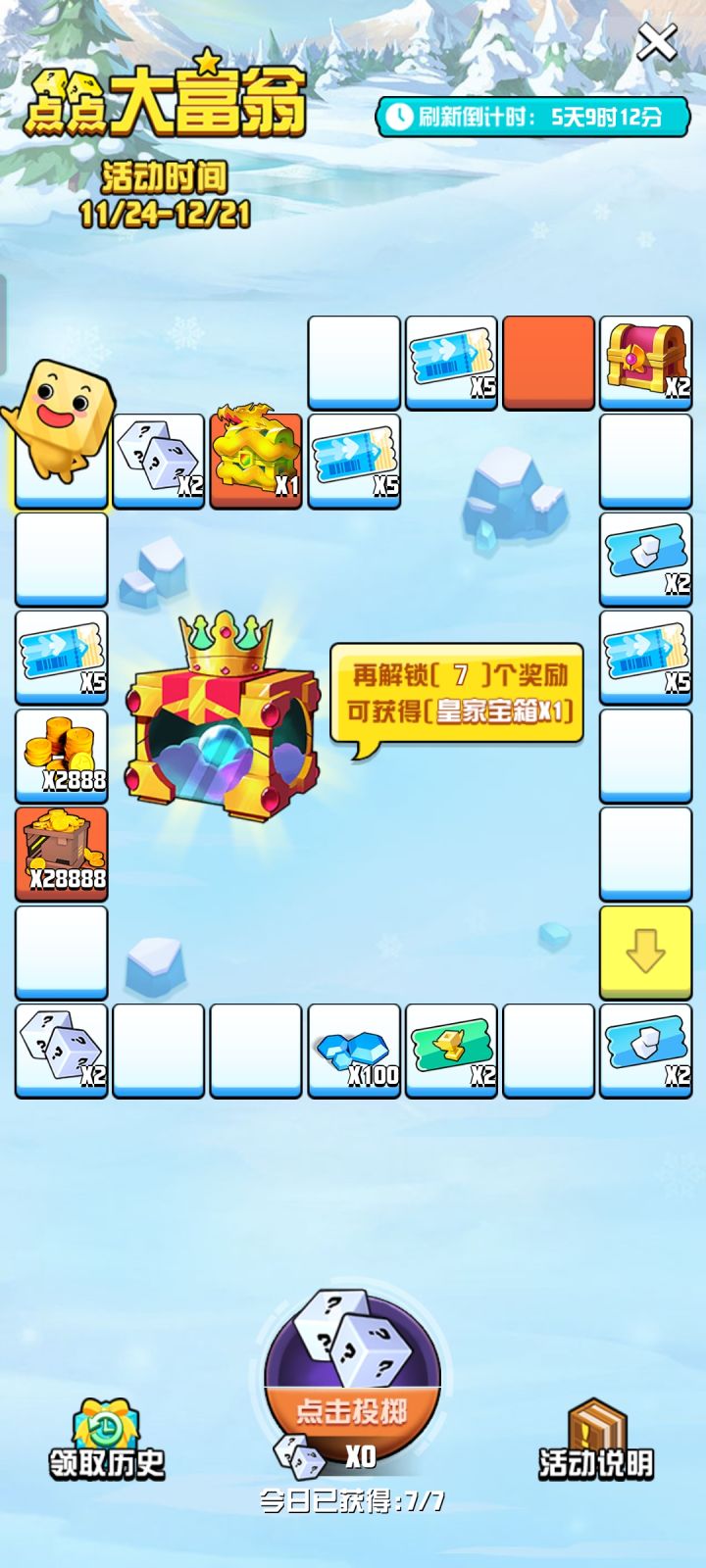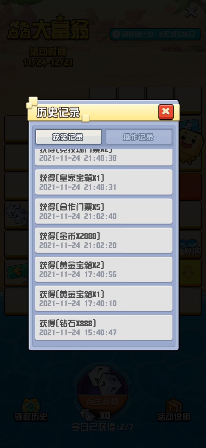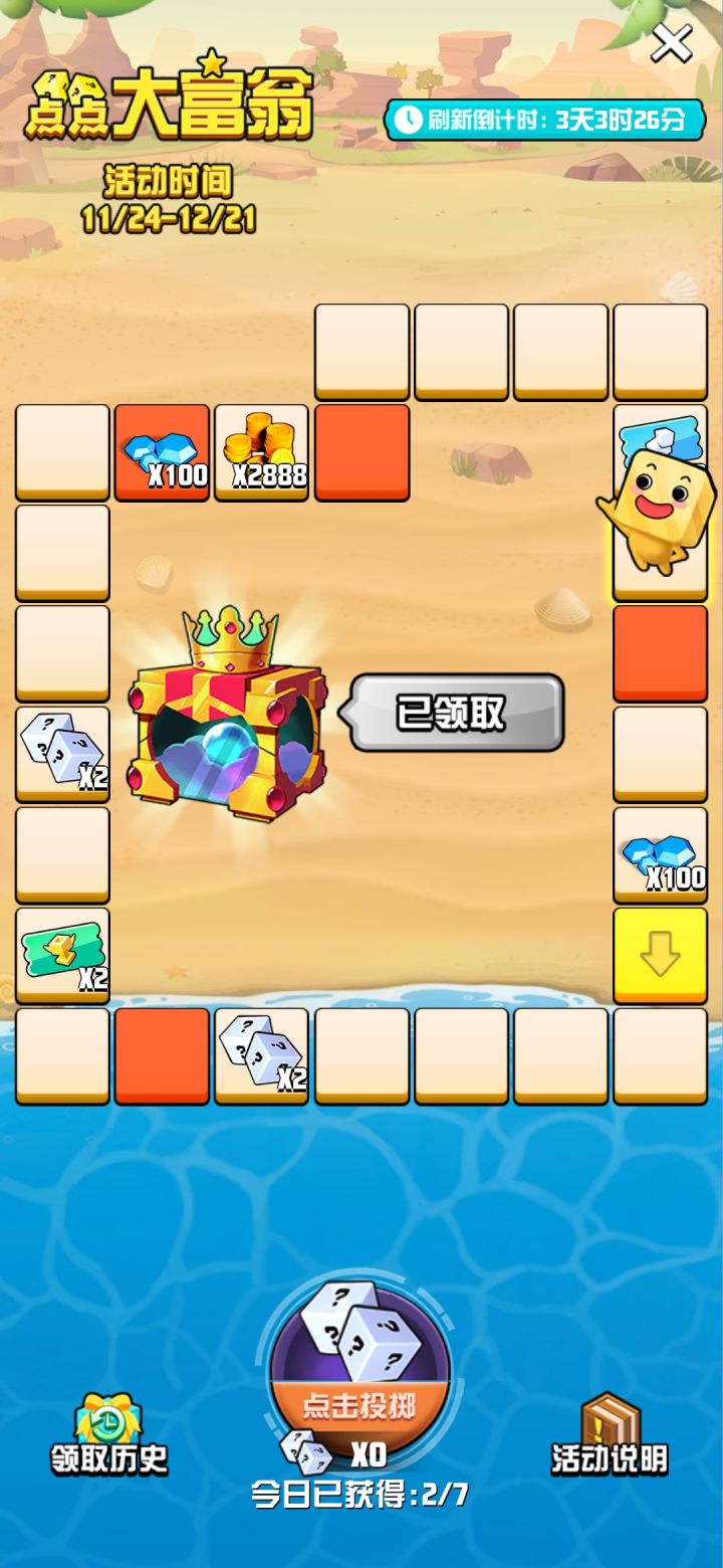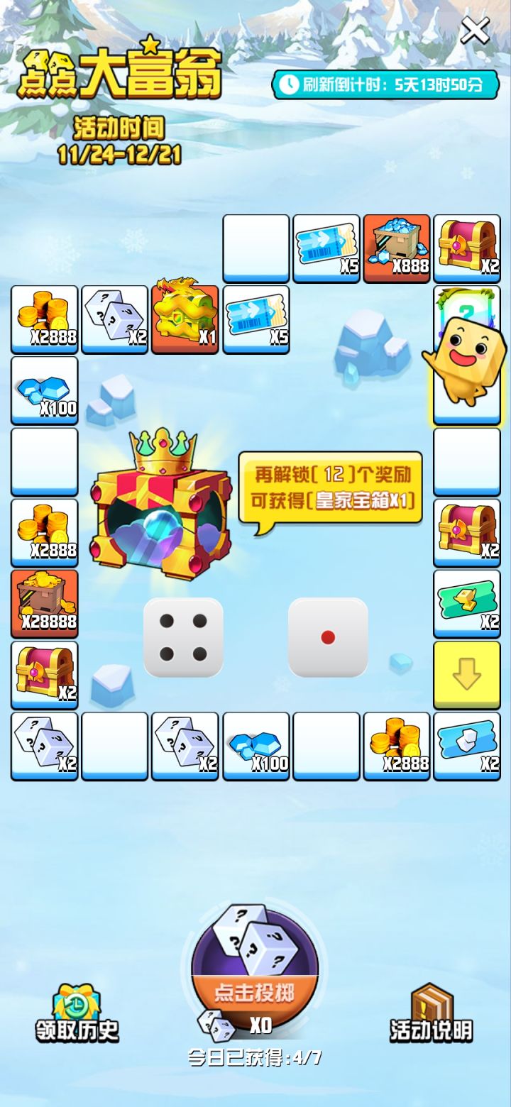 问题一:玩点点大富翁显示我获取了国王宝箱,但我邮件里并没有大富翁奖励获得国王宝箱的记录。游戏涉嫌欺骗玩家,让玩家做任务,完成18次大富翁奖励获取。努力去拿到国王宝箱,但是结果这个奖品压根是国王的新衣。说是给你了,其实什么都没有。我看了一下TAP论坛的帖子,至少还有两名玩家跟我是一样的问题。并且也没引起官方的回答。