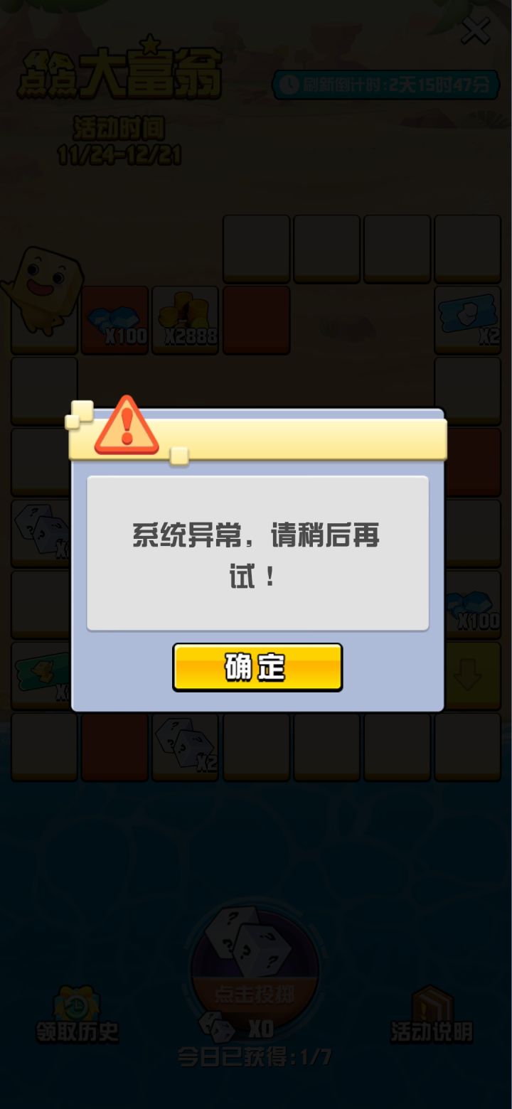 问题三:点点大富翁新功能模块上线以后我其实很开心。因为这个模块通过奖励的方式鼓励玩家多玩各种模式的对战,丰富了玩家的游戏体验并且刺激了消费。但是这个模块经常卡顿,不流畅,点了骰子要好久才反应。并且也有并未获得宝箱但是显示已经领取这样的问题。体验感极差。