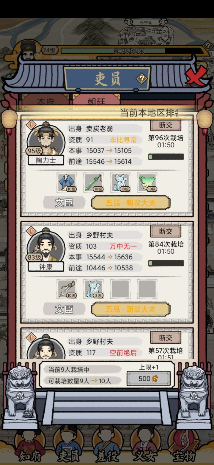 1.等级升的好慢啊2.升7品要判案100次,能看广告跳过吗?3.能不能弄个一键培养,栽培4.进朝廷了就不能送宝物,是怕贪污吗?