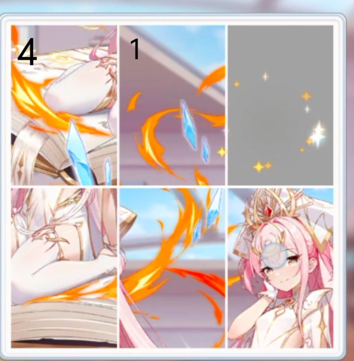 简单的应该都没什么问题。直接从普通难度开始了。第二难度是2*3拼图下面进行编号:以小幸为例:首先把1 2号拼图弄到一块以下有两种情况:1.一号拼图在右侧(顶层)按顺序依次点击可得:第二种稍微复杂点:一号拼图在左边(顶层)首先一样是先把1 2号拼图凑一起按顺序移动拼图:按顺序点击拼图:得:依次点击一二号拼图成功靠边,然后就变成2*2的拼图了OK啊。也是终于三出道了