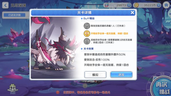 Hello大家好呀,这里是陌陌酱今天给大家带来的是陌陌酱深渊篇五——100%反伤·弃子流派反伤BOSS,一直都是大家一个头疼的点,陌陌其实研究出了不少对付的办法,但不管什么办法都离不开免死和无敌盾。说到无敌盾就想到了克罗爱和春梦,但春梦只能保护一个人,所以还是优选克罗爱。本次的BOSS词条是反伤100%+无敌盾+半兽增伤半兽增伤在反伤BOSS这里反而是debuff,她会让我们的半兽辅助更