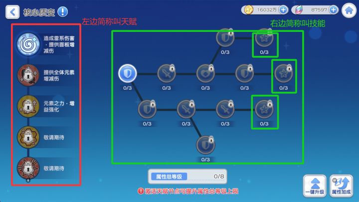 我们简称左边是元素天赋,右边是元素技能。那么天赋和技能哪个优先呢?优先获取什么材料呢?那当然是天赋最最最优先,每个少女开启3个天赋需要(启迪核心x10,质变因子x18,元素芯片x2)。6个少女就是×6,哇塞!那么天赋优先开启谁的呢?那必须是2个输出的呀。。。---------------然后就是右边的技能反直觉的是,最优先点完技能点的反而是辅助,越是增伤厉害的辅助越优先。卡莲,亚莉娅