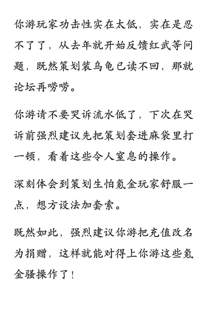 一 红武方面你游红武乘区还不如橙武稀有是怎么想的?泡泡枪伤害加成无上限叠加滚雪球,作为一把白嫖的武器泡泡枪确实亲民,但是这是你策划不把拉红武的人当人的理由?你看看现在输出红武哪一个对于玩到后面的人是有用的?现在打单体复活桩,九孔圣剑不如或者持平泡泡枪,王朝和凋零之吻甚至连出场机会都没有,做差异化红武结果深渊迷途还是千篇一律的阵容,是不是在想着周年庆出个全模式通解的红武泡泡枪来圈波大的😄,到老红武
