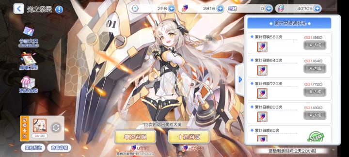 时经205天毕业了自己的第一个光道使,抽奖也是还可以平均60~70抽一张但晨曦之历比较欧11次中了8次其中两个还是最好的祭石箱子,但露妮亚专武才加5只能先放二队待着,希望下次暗卡池也能这么欧。